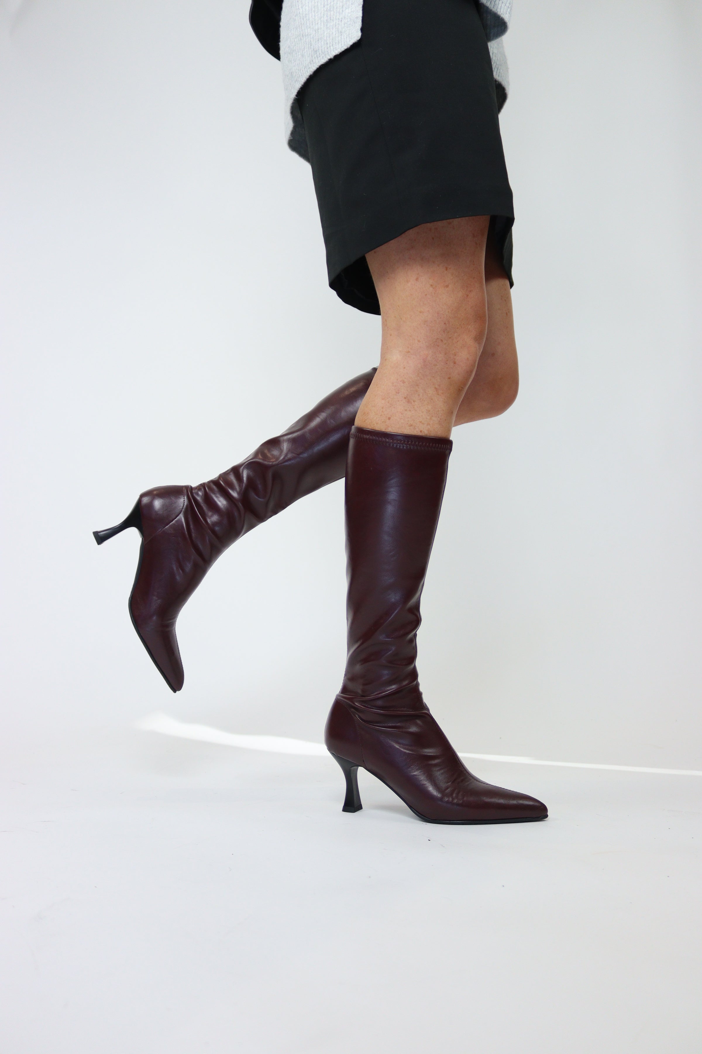 Make a statement with these stock, Stretch knee high boots featuring a squared off heel and pointed toe.  Elegant knee high boot boot with a stretch calf design that hugs your leg for a flawless fit.