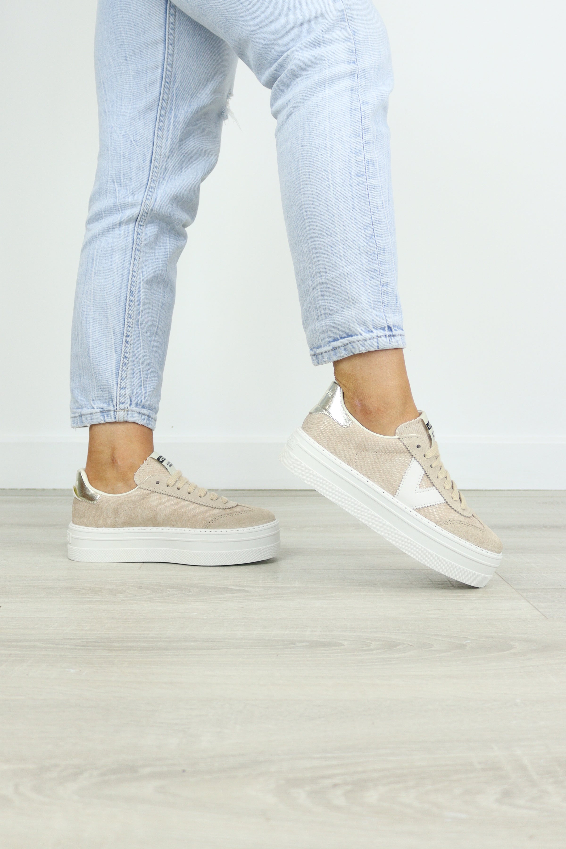 Add a touch of glamour to your everyday wardrobe with this stunning platform trainer. Featuring a sophisticated beige canvas upper adorned with shimmering gold accents, the Victoria 092181 perfectly balances casual comfort with eye-catching elegance.