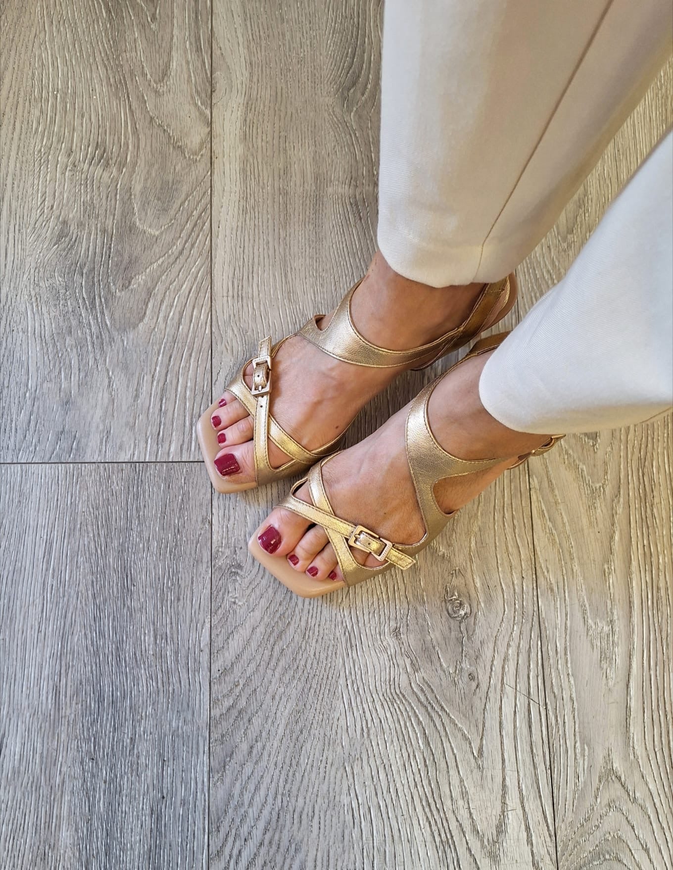 Expertly crafted in Spain by Hispanitas, a brand celebrated for its innovative designs and exceptional comfort, this sandal combines fashion-forward styling with all-day wearability. The eye-catching gold finish and decorative buckles create a stunning focal point that's sure to turn heads.