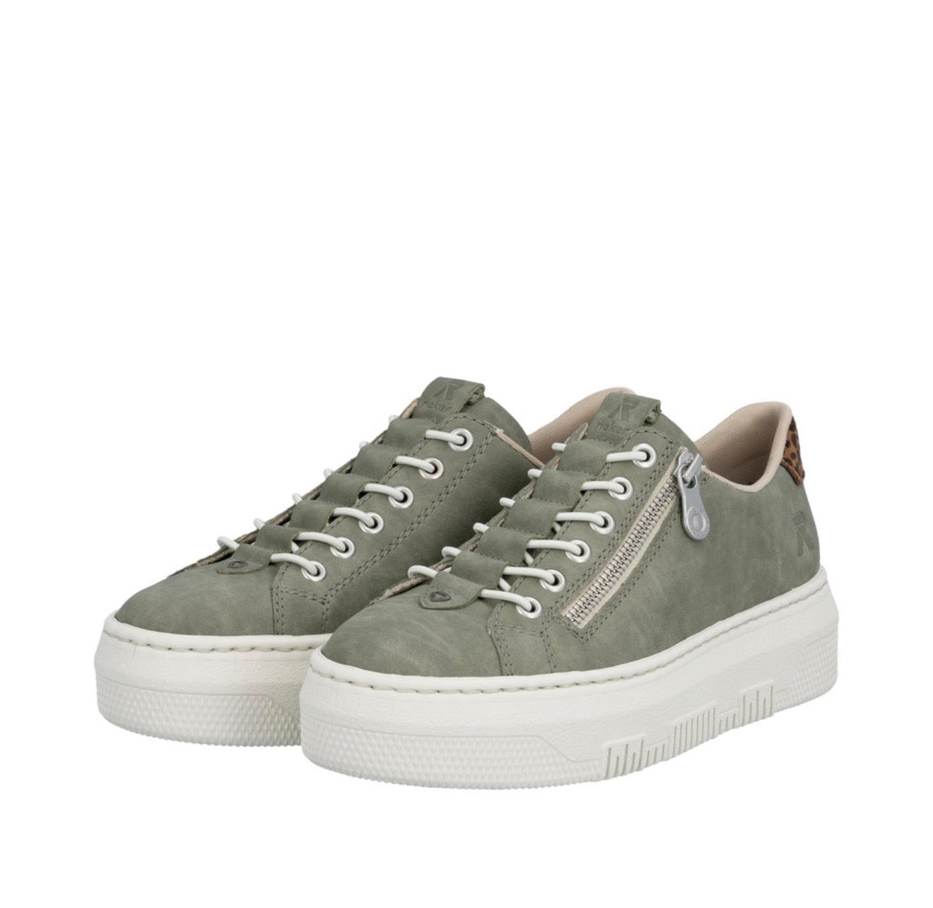 The Rieker M1912 khaki super light platform trainer is a stunning blend of style meets comfort.  The functional side zip ensures the perfect fit and no need to tie laces